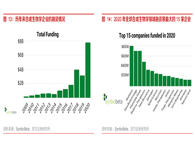 僅2021年第一季度,合成生物學領域的投資就超過2009-2019年11年的總額,僅略低于2020年全年的投資,如果當前的熱度及融資率維持不變,預計合成生物學行業(yè)融資額將較2020年增長200%-400%。