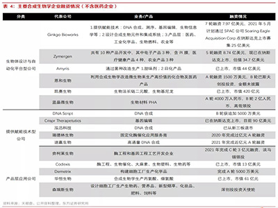 2、技術平臺:DNA閱讀、寫作和編輯技術的不斷進步、DNA測序時間和成本的持續(xù)降低等以多種方式驅動著合成生物學的發(fā)展,提供賦能技術型公司顯然是吃香的,如提供基因合成、基因測序和基因編輯等服務的上市公司。